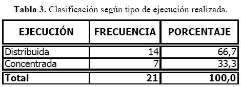 - Ejecución Concentrada, cuando se presentaron tres o menos tramos en la ejecución de la tarea y aumentando en consecuencia la carga de trabajo, afectando la asimilación por la ley de los rendimientos decrecientes . Los resultados encontrados se presentan en la tabla siguiente: