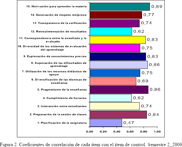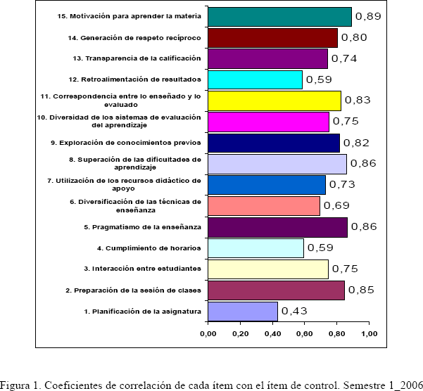 El análisis de los datos implicó calcular la correlación de cada ítem con el de control. Para el propósito, se utilizó el coeficiente de correlación de Pearson que significa que a mayor coeficiente de correlación, mayor la capacidad predictiva de un ítem sobre la calidad docente. Los resultados obtenidos para el primer semestre de 2006, son los siguientes: