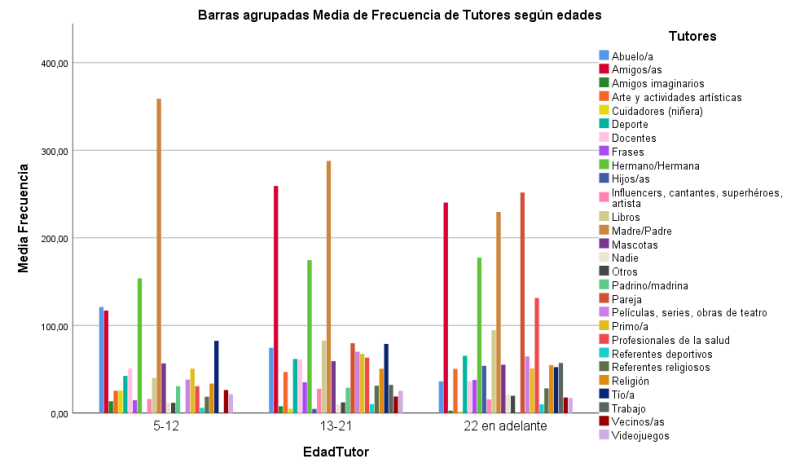 Se observan variaciones en la elección de tutores según el rango etario. Los progenitores y abuelos son más comunes en las etapas más tempranas de la vida (5 a 12 años), mientras que los amigos y los tutores de resiliencia no humanos adquieren mayor relevancia en la adolescencia y la adultez temprana. En la etapa de 22 años en adelante, las parejas y profesionales de la salud emergen como tutores de resiliencia importantes, lo que sugiere un cambio en la red de apoyo a medida que los individuos avanzan en edad.