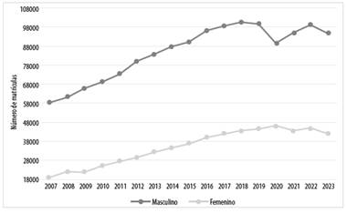 A lo largo del periodo de análisis, se evidencia claramente que, en general, existe una tendencia de aumento en la matrícula universitaria (masculina y femenina) a nivel Bolivia, en áreas de Ingeniería y Tecnología. Durante la gestión 2007 se registró un total de 19.085 matrículas universitarias femeninas frente a 58.452 matrículas masculinas. Durante el año 2023 se tuvo un total de 42.018 matrículas femeninas, frente a 94.511 matrículas masculinas, evidenciando un aumento de más del doble de la cantidad de matrículas femeninas en el periodo analizado. Sin embargo, si se extiende esta comparación con los datos masculinos, se advierte que la diferencia se mantiene a más del doble durante cada año.