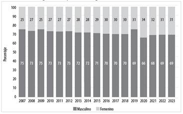 En cuanto a la variación porcentual de los años considerados para el análisis, el Gráfico 2 permite identificar la brecha de género existente, confirmando la subrepresentación femenina en dichas áreas.