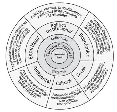 En ese sentido, Mérida Coimbra, Sanchez Mitru, Cardona Garcés y Solíz (2013, pp. 16 y 17) exponen los primeros acercamientos sobre “turismo biocultural” (TB), refiriéndolo como una nueva manera de concebir la gestión del turismo, más integral entre los ámbitos natural y cultural, que pretende internalizar las externalidades de impactos ambientales y culturales que genera la actividad turística. También plantean algunos principios del enfoque, todos ellos, evidentemente, aún conceptos en desarrollo.