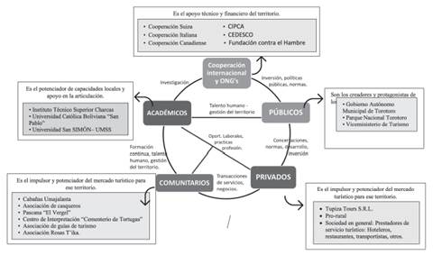La sinergia que existió entre estas instituciones y las personas que las componen fue la clave para el éxito en el trabajo de implementar la actividad turística, dando el beneficio a la población en general de Torotoro y sus comunidades. El trabajo y desempeño de cada uno de los actores resultó determinante al momento de planificar y ordenar las actividades turísticas, con diferentes funciones y desde el ámbito en el cual se desempeñan cada uno, tal como se describe en el siguiente gráfico.