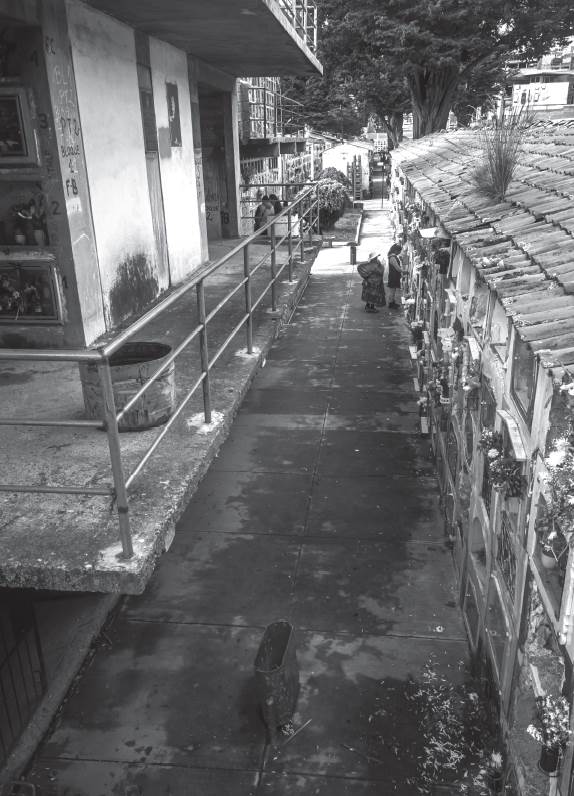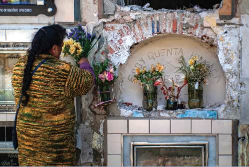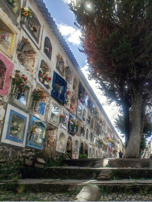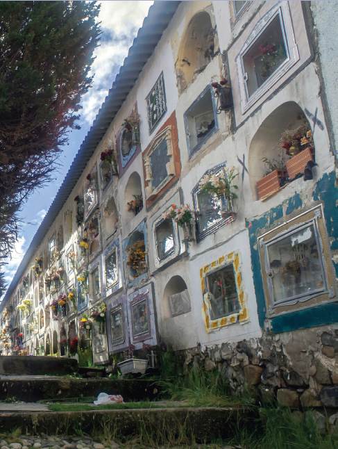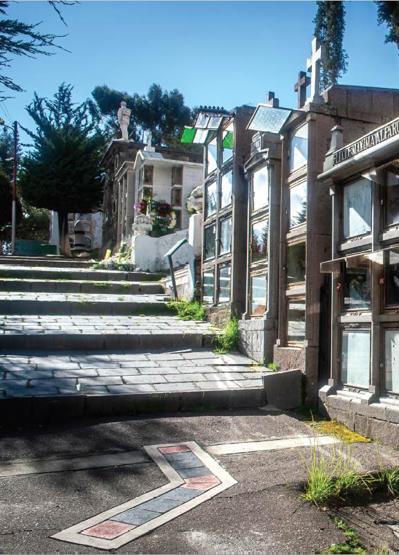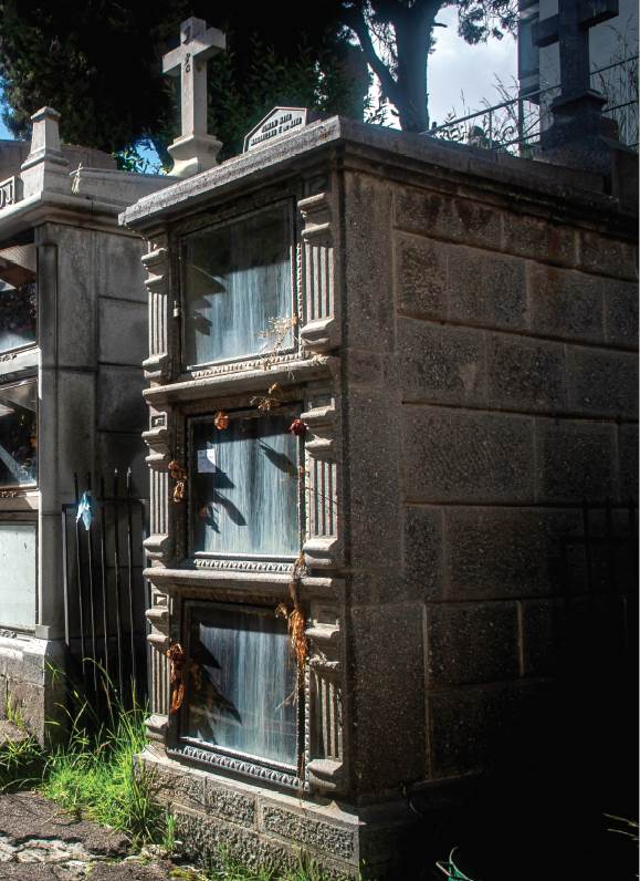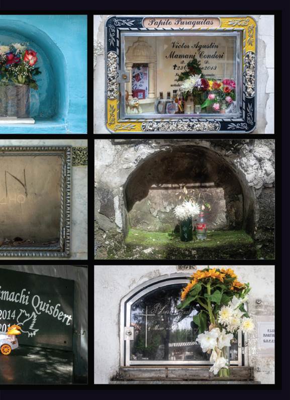 El Cementerio General se extiende como una analogía a la ciudad. Cubre más de 92.000 m², a los que se accede a través de nueve ingresos distribuidos a lo largo de su perímetro. Adentro, el silencio no es ausencia, sino presencia. Posee una calma intensa que inquieta. La naturaleza -indiferente ante el dolor de quien ya no está- actúa, se apropia y se entrelaza con las tumbas: enredaderas que abrazan cruces, raíces que rompen el mármol y musgos que borran nombres, arrastrándolos hacia el olvido, en una batalla lenta y paciente entre lo eterno y lo efímero. Los nichos se alinean en fi las y columnas dentro de bloques geométricos, formando cuarteles que se pierden en la distancia. Algunos exhiben ramos frescos de colores encendidos, muy bien cuidados, protegidos del polvo y el abandono; otros, solo guardan restos de fl ores marchitas, ahogadas en agua verduzca y maloliente. La estética, en cada tumba, es de modos y maneras variables, es cosa de vivos; ellos marcan las diferencias entre unos y otros. Por fuera, se aprecian revoques toscos y minimalistas, placas de aluminio pulido, sencillas rejas metálicas, cruces de mármol importado, pero por dentro -en un espacio de 0,90 por 0,75 y 2,60 de profundidad- no hay diferencias ni distinciones, solo despojos humanos. Las tumbas son memoria, el mármol guarda el recuerdo, pero no así la historia. Un nombre, una sigla y una fecha pretenden resumir una existencia entera: “Eloy Quenta Huanca, Q.E.P.D., 19-12-21”. ¿Quién fue Eloy? ¿Quiénes fueron sus padres, amó, sufrió, se casó, tuvo hijos, tuvo miedo antes de morir? Y, como Eloy, miles de vidas reducidas a simples inscripciones.