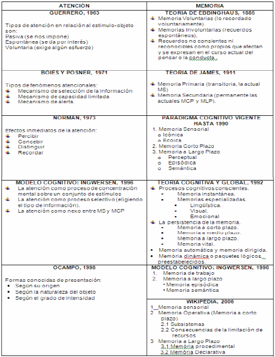 Estos hechos han llevado a los psicólogos a distinguir y analizar diversos tipos de memoria, es decir que existen muchas clasificaciones sobre la memoria. A continuación detallaremos las más relevantes en la investigación, para lo cual recurriremos a una tabla donde aparecerán simultáneamente la clasificación de atención y la de memoria, por establecerse entre ellas una relación de proceso-función consecuente: (Ver Tabla 1.1)
