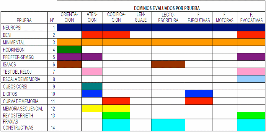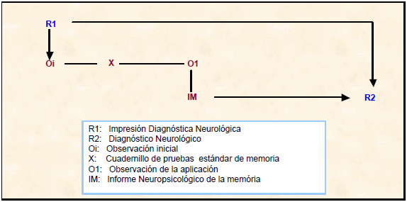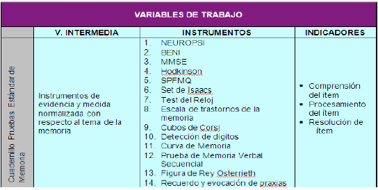 La búsqueda de instrumentos estándar de evaluación de la memoria, utilizados a nivel hospitalario, arrojo una lista de catorce instrumentos (Neuropsi, BENI, Minimental, Hodkinson, PFFEIFER, ISAACS, Test del Reloj, Escala de Trastorno de la Memoria, Cubos de Corsi, Dígitos, Curva de Memoria, Prueba de Memoria Verbal Secuencial, Figura del Rey de Osterrieth, Recuerdo de Evocación de Praxias Constructivas.) con los cuales se diseñó un cuadernillo de evaluación cualitativa y cuantitativa sin variación alguna de los ítems y con la finalidad de observar su comportamiento al momento de ser administrados.