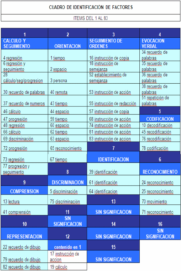 También se ha podido establecer la relación con las Habilidades Cognitivas propias de los dominios y que se encuentran presentes en los 83 Ítems. A continuación se detalla esta relación final que es la base del instrumento planteado como consecuencia de esta investigación la "Evaluación Diferencial de la Memoria"