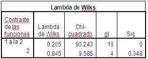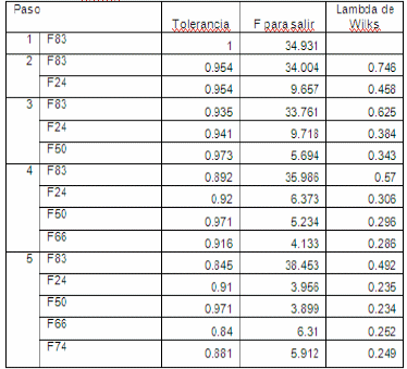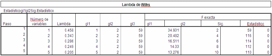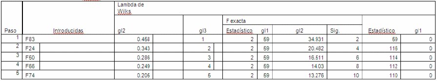 En cada paso se introduce la variable que minimiza la lambda de Wilks-global