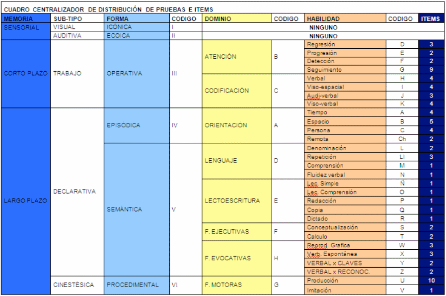 Plantea un cuadro centralizador de distribución de pruebas e ítems y también una matriz centralizadora de los resultados obtenidos en cada dominio neuropsicoiogico y habilidad cognitiva