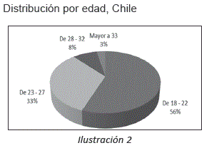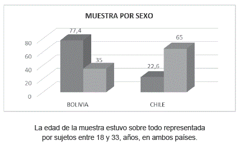 La muestra estuvo constituida por 397 estudiantes universitarios, 198 chilenos y 197 bolivianos, con edades que fluctuaban entre 18 a 33 años. De los cuales 77,4% eran mujeres en la muestra boliviana y 35% en la muestra chilena. La condición socioeconómica, fue clase media, según datos de clasificación señalados por los participantes en ambos países. La prueba fue tomada en cada país, su selección fue de tipo no probabilística o intencionada de tipo estratificada con asignación fija. Este tipo de muestra es útil para estudios de perspectiva fenomenológica donde el objetivo es analizar los significados de un determinado grupo social.