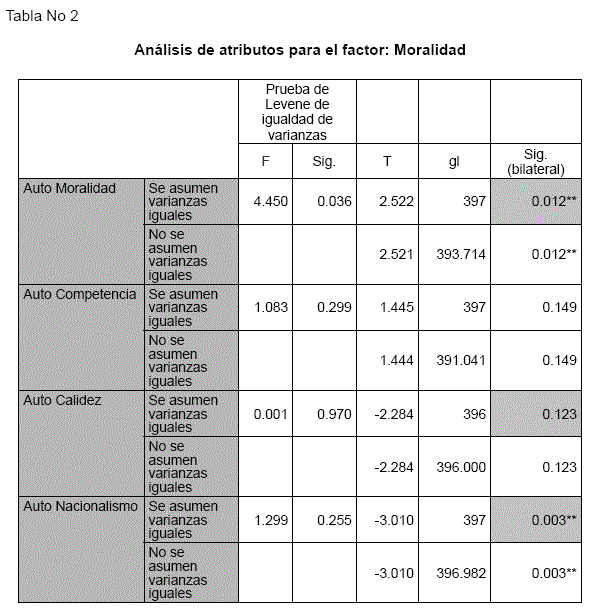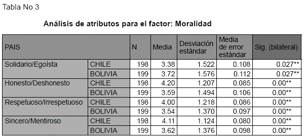 Un análisis de atributos por factores señala que: para el factor "moralidad", de los 7 atributos de la escala, 4 presentan una diferencia significativa p<.05, y 3 atributos: "confiables"; "honrados" y "cultos" no demostraron diferencias entre grupos. Aunque el análisis de medias entre muestras no presenta diferencias para el atributo "corrupción", llama la atención que este atributo arrojó medias elevadas tanto para la muestra chilena, como, para la boliviana. Chile M= 4.32; Bolivia M=4.30, demostrando que ambos grupos se auto perciben "corruptos".