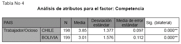De los 6 atributos medidos en este factor, el único con diferencia significativa fue el de "trabajador", p<.01, el grupo boliviano se auto percibe en este ítem superior al grupo chileno. Los otros atributos, no obtuvieron diferencias significativas, quedando demostrado que ambos grupos se auto perciben similares en los atributos de "emprendedores", "creativos", "inteligentes", "capaces" y "éxitosos"