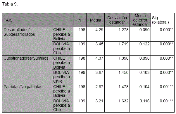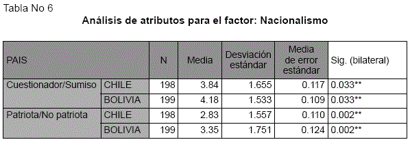 Un análisis comparado entre la muestra chilena y la boliviana, para el factor nacionalismo, señala que los 3 atributos medidos en este factor presentan diferencias estadísticamente significativas p<.01. Los resultados obtenidos muestran que el grupo boliviano percibe al chileno como más "desarrollado", y más "cuestionador". Por su parte el chileno percibe a los bolivianos como altamente "patriotas", pero, "subdesarrollados" y "sumisos", arrojando las medias obtenidas en estos atributos un nivel superior a la media establecida.