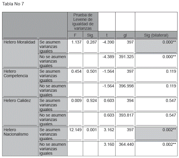 Con relación a las dimensiones autoestereotípicas, a nivel descriptivo se aprecia que en la muestra general existen diferencias significativas p<.05 entre la auto percepción de chilenos y bolivianos, para los factores de moralidad y nacionalismo. Los factores, calidez y competencia no presentaron diferencias significativas.
