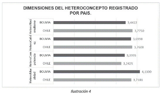 El grupo chileno se auto percibe más nacionalistas M= 3.58 que el grupo boliviano, M=3.88, p <.05. Al contrario, en el factor moralidad, la muestra boliviana se auto percibe mucho más moral que la imagen que tienen de si mismos la muestra chilena, el análisis de medias arroja una M= 3.75 para la boliviana y, una M = 4.5 para la muestra chilena, p<.01 (análisis de contravalores).