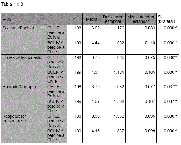 Los resultados de los atributos que presentan diferencias significativas muestran que el grupo boliviano se auto percibe más: "honesto", "respetuoso" y "sincero", que la visión que tienen de sí mismos sus pares chilenos. Mientras que el grupo chileno se auto perciben más "solidario", que la imagen que tienen de si mismos el grupo boliviano. Es interesante notar que la muestra chilena arroja un resultado superior a la media en estos atributos, sugiriendo que existiría una elevada autopercepción de ser "deshonestos", "irrespetuosos" y "mentirosos". Por su parte los puntajes obtenidos por el grupo boliviano muestran una ligera tendencia a auto percibirse como "egoístas" y "mentirosos".