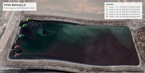 La PTAR Magollo cuenta con seis módulos de lagunas de estabilización, dos de ellas construidas en una primera fase, dos en segunda fase y dos en la tercera fase; cada módulo está compuesto por una laguna primaria y una laguna secundaria (Cauna, 2020). Para la presente investigación se recogieron los lodos residuales de la tercera laguna primaria del quinto módulo (Figura 2), escogiéndose 5 puntos de monitoreo (Figura 3). Esto debido a su fácil accesibilidad y a que las lagunas primarias poseen mayor toxicidad que las lagunas secundarias y se desea saber qué tanto es posible estabilizar a este residuo a partir de la vermiestabilización.