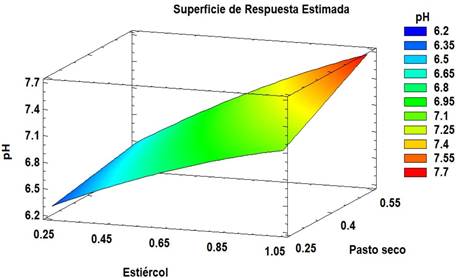 De acuerdo a la superficie de respuesta que se observa en la Figura 6, se puede afirmar que a partir de la adición de 0,689 kg de estiércol vacuno, 0,380 kg de pasto seco, 1 kg de lodos residuales y la acción de 0,1 kg de Eisenia foetida adulta durante 70 días, se puede obtener un pH de 7, el cual resulta óptimo.
