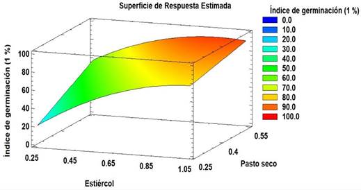 Figura 8 Superficie de respuesta estimada del índice de germinación de la prueba directa de toxicidad aguda de los sustratos tratados