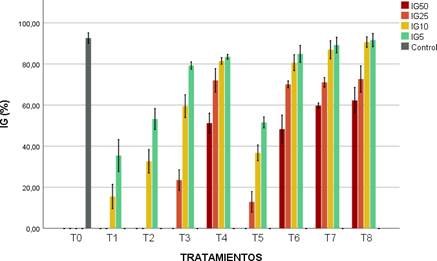 Índice de germinación de la prueba de toxicidad aguda con extractos de los sustratos tratados