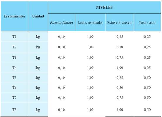 Para la etapa experimental, se utilizaron cajas de madera (con dimensiones de 20 x 20 x 10) forradas con plástico en las que se mezclaron los lodos residuales, el pasto seco y el estiércol vacuno (Figura 4). Posteriormente, se adicionaron las lombrices californianas para iniciar el proceso de vermiestabilización. Se utilizó un diseño multinivel de 4 x 2 con tres repeticiones, resultando un total de 24 unidades experimentales. Se establecieron las distintas cantidades de estiércol vacuno y pasto seco. Los lodos residuales y la cantidad de Eisenia foetida se mantuvieron constante en todos los tratamientos, tal y como se muestra en la Tabla 1.