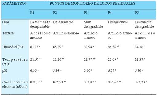 En la Tabla 2 se muestran las características fisicoquímicas de las muestras de lodos residuales por cada punto de monitoreo, donde se puede destacar que, en todos los puntos, el olor y textura fue similar teniendo un aroma desagradable y presentando una textura arcillosa arenosa.