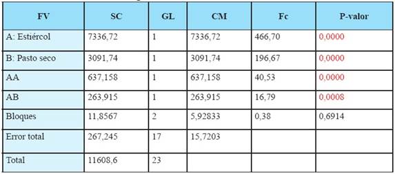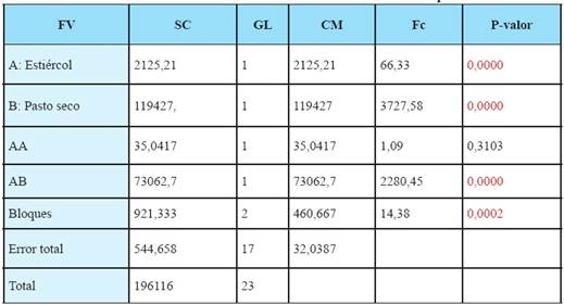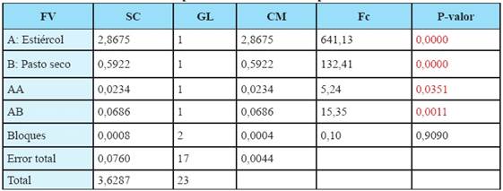 En la Tabla 3 se muestra el análisis de varianza del pH de los sustratos vermiestabilizados en los que se establecieron distintas cantidades de estiércol vacuno y pasto seco, con la finalidad de determinar si estas variables tuvieron algún efecto.