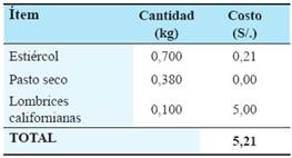 Según datos teóricos de una estimación de la generación de lodos al 2021 en función al incremento en el tratamiento de aguas residuales en la PTAR Magollo sería de 2 331,32 toneladas de lodos residuales, representando así un alto potencial de riesgo a la salud y al ambiente, por lo que calculando costos del tratamiento a partir de un aproximado de la estimación óptima (Tabla 6), se tendría que por cada kilo de lodos residuales tratados se invertiría un total de S/. 5,21 en solo insumos del tratamiento, y este precio estaría en función inicial a la inversión de las lombrices que luego se multiplicarían y podría disminuir los costos futuramente mediante la cosecha y uso sostenible.