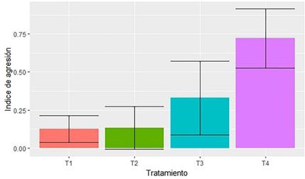 Figura 2 Resultado de la ANOVA que compara los cuatro tratamientos con el Índice de Agresividad, donde: T1= colmena control (madre); T2= colmena emparentada (hija); T3 = colmena no emparentada (silvestre); T4 = colmena de otra especie (Tetragonisca fiebrigi).