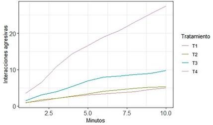 Posteriormente, se realizaron curvas de acumulación para cada tratamiento de los comportamientos agresivos en el tiempo (durante los 10 minutos). Esto con el objetivo de visualizar de qué manera las interacciones agresivas se dan con el paso del tiempo y si se producen de forma más rápida o lenta según los diferentes tratamientos.