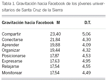 Para conocer la gravitación hacia Facebook de los jóvenes universitarios de Santa Cruz de la Sierra se analizó la media de cada una de las dimensiones respondidas en el cuestionario GoToFB (Tabla 1).