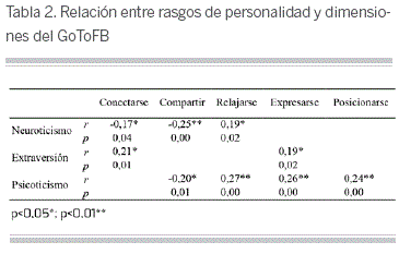 Las correlaciones encontradas son débiles pero significativas, se observa que la relación de Neuroticismo con Conectarse es negativa (r = -0,12; p = 0,048), y positiva la relación con Relajarse (r = 0,15; p = 0,01) y Posicionarse (r = 0,12; p = 0,047). La única dimensión que correlacionó significativamente con Extraversión fue Conectarse, aunque la correlación fue débil (r = 0,18; p < 0,001).