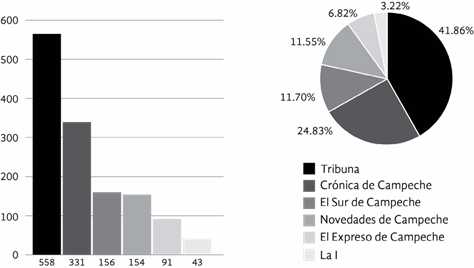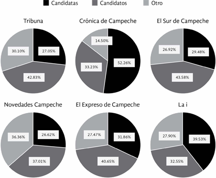 Con respecto al número de notas, el periódico Tribuna publicó 558 en contraste con el periódico La i, que sólo tuvo 43, lo que los posiciona como los rotativos con mayor y menor presencia de notas dedicadas al proceso electoral en el que se menciona a las candidatas. Traduciendo esta información a porcentajes, los periódicos Tribuna y Crónica de Campeche albergan más de la mitad del total de las notas (66.69 %), teniendo el primero el 41.86%, seguido del periódico Crónica de Campeche con el 24.83 %. En la Figura 1 se aprecia la cantidad y porcentaje correspondiente a las publicaciones analizadas.
