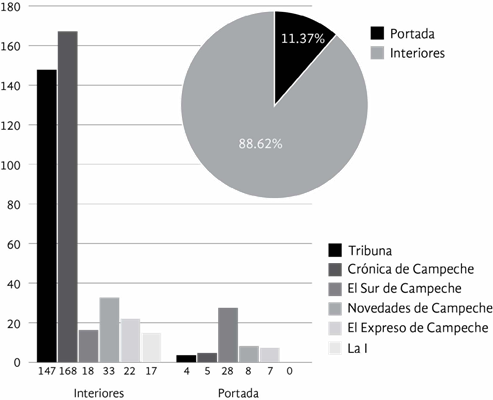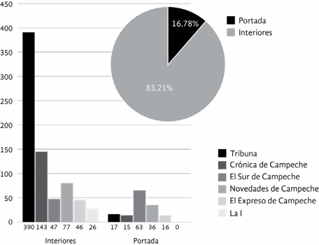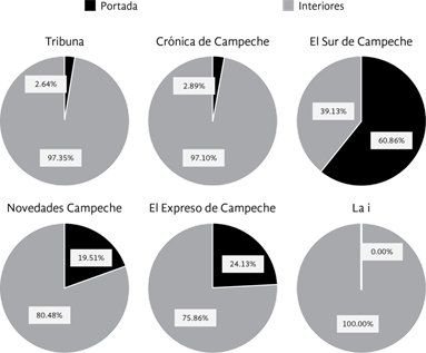 En la información para candidatos, de las 876 notas donde se localizan como primeros actores, el 16.78% están en la portada de los periódicos, destacando que en El Sur de Campeche se publicaron más notas de los candidatos en la portada que en los interiores, a diferencia de sus homólogos que posicionaron la mayor cantidad de información en el interior de los rotativos.