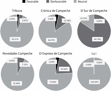 Sin embargo, el análisis individual de los periódicos destaca que La i tiene el 100% de notas neutrales mientras Tribuna, Crónica de Campeche, Novedades Campeche y el Expreso de Campeche manejaron, mayormente, este tipo de información. El Sur de Campeche se destaca con un 84.78% de notas desfavorables. En la Figura 12, se presentan los porcentajes para notas favorables, desfavorables y neutrales, por periódico.