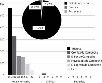 De los géneros periodísticos analizados, se observó un arrasador 98.79 % de notas informativas, contra un escaso 0.97 % de crónicas y 0.22 % de entrevistas plasmadas en los impresos diarios. Esto refleja la fugacidad de la información, ya que sólo el periódico Crónica de Campeche publicó 13 crónicas informativas y el periódico Tribuna, tres entrevistas, lo que denota la poca investigación sobre el tema. En la Figura 2 se aprecia la cantidad y porcentaje de trabajos por género periodístico.