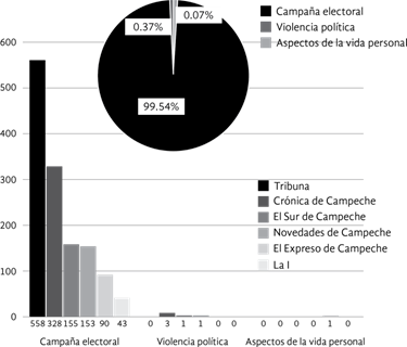En lo referente al tema de cada una de las notas, se identificaron tres como principales: campaña electoral (99.54%), aspectos de violencia política (0.37%) y aspectos de la vida personal del candidato (0.07%). Únicamente Novedades de Campeche, Crónica de Campeche y El Sur de Campeche publicaron una, tres y una nota, respectivamente, sobre violencia política y, el Expreso de Campeche publicó una nota sobre aspectos personales de la vida de la candidata. En la Figura 3 se muestra las cantidades y porcentajes correspondientes a las temáticas abordadas en las notas de cada periódico.