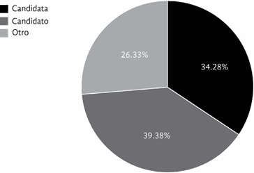 En el rubro de importancia y relevancia de la nota, se detectó que, del total de publicaciones analizadas, en el 34.28% las candidatas eran el personaje principal de la publicación, es decir, la información giraba en torno a ellas y no como acompañantes de otro candidato de su partido o coalición. En un porcentaje muy cercano, pero superior al de las candidatas, estuvo el que consideró a los candidatos como personajes principales, con un 39.38%, mientras que el 26.33% restante corresponde a notas que tenían a dirigentes de partidos, excandidatos, expresidentes o voceros que mencionaban a las candidatas, pero no eran la primera fuente de información. En la Figura 4 se muestran los porcentajes totales de notas dedicadas a candidatas, candidatos y otros como personajes principales.