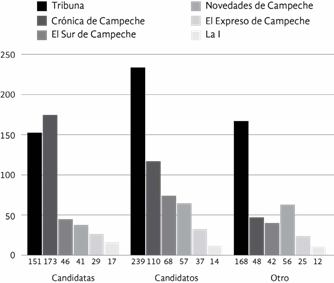 Es importante destacar que, aunque se registran avances en temas de equidad de género y no violencia hacia las mujeres (en todos los aspectos), aún persisten patrones culturales que se dejan ver en la redacción de las notas (visualizar primero el nombre de los candidatos) y en las fotografías utilizadas para ilustrarlas, sobre todo, cuando existe morbo de por medio (como se pudo observar en la fotografía de la candidata Biby Rabelo al ser “nalgueada” por su compañero candidato a la gubernatura, Eliseo Fernández). En contraste, los candidatos poseen un mayor número de notas y la posición, en los periódicos impresos analizados, los favorecen.