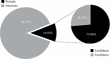 Continuando con el rubro de la importancia y relevancia de la nota, la posición que ésta ocupa en el periódico también es un elemento importante a considerar. El 14.92% de ellas se ubicó en la portada y el 85.07%, en los interiores, destacando que, de las 199 notas en portada, 73.86% (147 notas) fueron de candidatos como personaje principal y sólo el 26.13% (52 notas) fueron de candidatas. En la Figura 7, se puede observar los porcentajes de las notas en portada e interiores, así como el porcentaje representativo para candidatos y candidatas de las notas en portada.