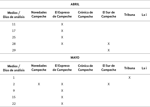 La población estuvo integrada por seis periódicos estatales: Tribuna, Crónica de Campeche, El Sur de Campeche, Novedades Campeche, El Expreso de Campeche y La i, en 66 días comprendidos entre el 29 de marzo al 2 de junio de 2021.