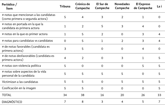 En la Tabla 2 se plasman los ítems vinculados al diagnóstico. Se calificó con escala del 0 al 5, siendo 5 la mejor puntuación, con base en los datos obtenidos de los seis periódicos. En ella se puede detectar que tres periódicos resultaron reprobados: El Sur de Campeche, Novedades Campeche y El Expreso de Campeche, al obtener menos de 28 puntos. Los otros tres periódicos: Tribuna, La i y Crónica de Campeche obtuvieron puntuaciones de 7, 7 y 8, respectivamente, resaltando que esta valoración tiene base en la perspectiva de igualdad que le proporcionaron a las candidatas y candidatos en sus páginas.