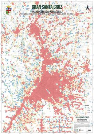 Este plano visualiza de manera clara las zonas con mayor densidad en el territorio metropolitano; información hasta ahora inédita en la región. El valor de esta información radica precisamente en la escasez de datos a escala metropolitana (Prado, 2019), lo que muestra el grado de conurbación entre los municipios que conforman la Gran Santa Cruz. Asimismo, se evidencia claramente el alto grado de dispersión sobre el territorio (Figura 3).