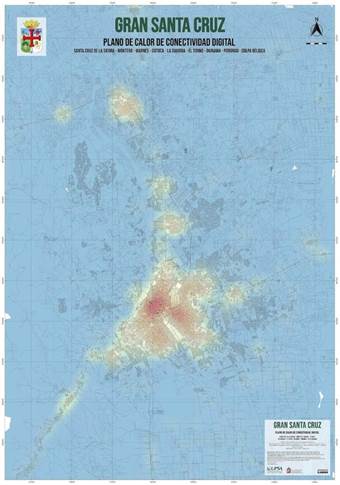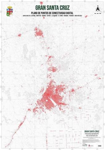En contraste, el plano de Puntos de Conectividad Digital presenta la misma información, pero con una representación gráfica diferente. En este caso, se puede apreciar con claridad el grado de ocupación en el área metropolitana, así como también, los asentamientos rurales. De igual forma, este mapa muestra la morfogénesis de varias poblaciones emergentes en el territorio, lo cual brinda la oportunidad de monitorear de manera continua su evolución y crecimiento a través de esta herramienta de trabajo (Inter-American Development Bank, 2015).