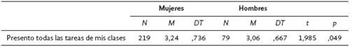En esta sección sólo se encontró una diferencia significativa entre padres y madres estudiantes y es la siguiente: las mujeres presentan con mayor frecuencia las tareas universitarias, en relación a los hombres.