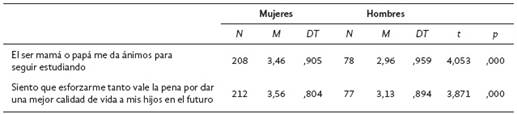 En este apartado se encontraron dos diferencias significativas entre padres y madres universitarios. A las mujeres, el ser madre les da más ánimos para seguir estudiando y además sienten que vale la pena esforzarse por dar una mejor vida a sus hijos, en comparación con los hombres.