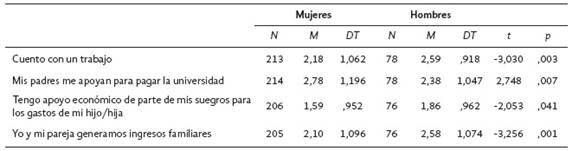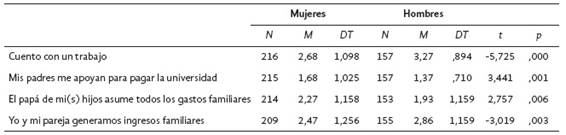 En este apartado se encontraron cuatro diferencias significativas entre padres y madres estudiantes. Los hombres con mayor frecuencia cuentan con un trabajo y están más de acuerdo con que ellos y su pareja generen ingresos familiares, en comparación con las mujeres. Las mujeres tienen más apoyo económico de sus padres para pagar la universidad y afirman que el padre de sus hijos es el que asume los gastos de la familia.