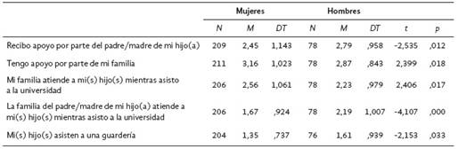 En esta sección se encontraron cinco diferencias significativas entre padres y madres estudiantes. Los varones reciben más apoyo por parte de la madre de su hijo, así también tienen más apoyo de la familia de la madre de su hijo, en comparación con las mujeres. Además, con mayor frecuencia los hijos de los varones asisten a una guardería. Las mujeres reciben más apoyo de su propia familia y es esta la que colabora con el cuidado del hijo para que asista a la universidad, en relación a los hombres.