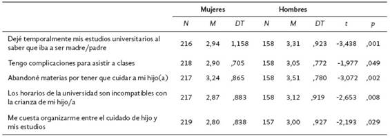 En esta sección se hallaron cinco diferencias significativas entre padres y madres estudiantes. Los hombres dejan menos sus estudios al saber que van a ser padres, tienen menos complicaciones para asistir a clases, abandonan menos frecuentemente materias por cuidar a su hijo, los horarios de la universidad les parece menos incompatibles y les cuesta menos organizarse entre la crianza de su hijo y sus estudios, todo esto en comparación con las mujeres. En términos generales, a las mujeres les cuesta más equilibrar entre la crianza de su hijo y sus estudios universitarios.