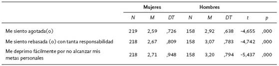 En esta parte se encontraron tres diferencias significativas entre padres y madres universitarias. Las mujeres se sienten más agotadas, más rebasadas por tanta responsabilidad y más deprimidas por no poder alcanzar sus metas personales, en comparación con los hombres.